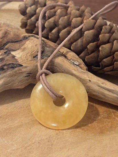 Collier pendentif donut, pierre semi-précieuse de Citrine (40mm), sur du cuir brun, longeur ajustable